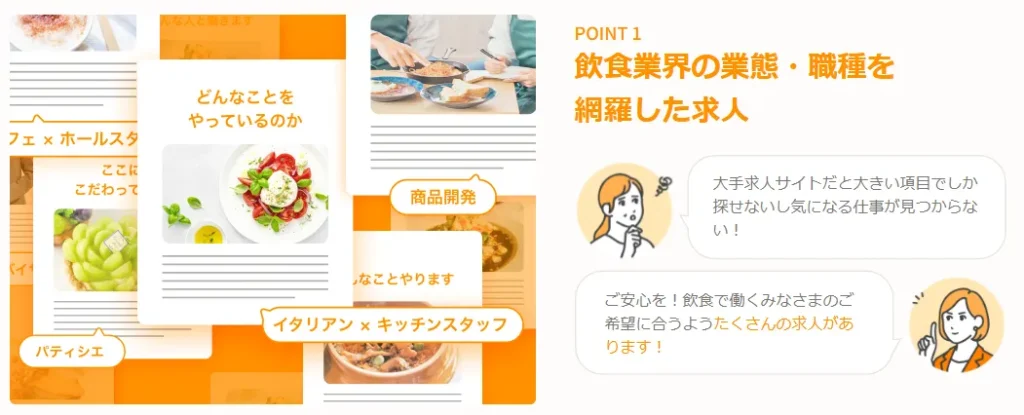 例えば、リクルートエージェントが万人向けなら、フーズラボは調理師向けの特化型転職エージェント。