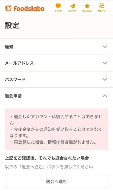 フーズラボは他社転職エージェントと比べても退会が簡単。